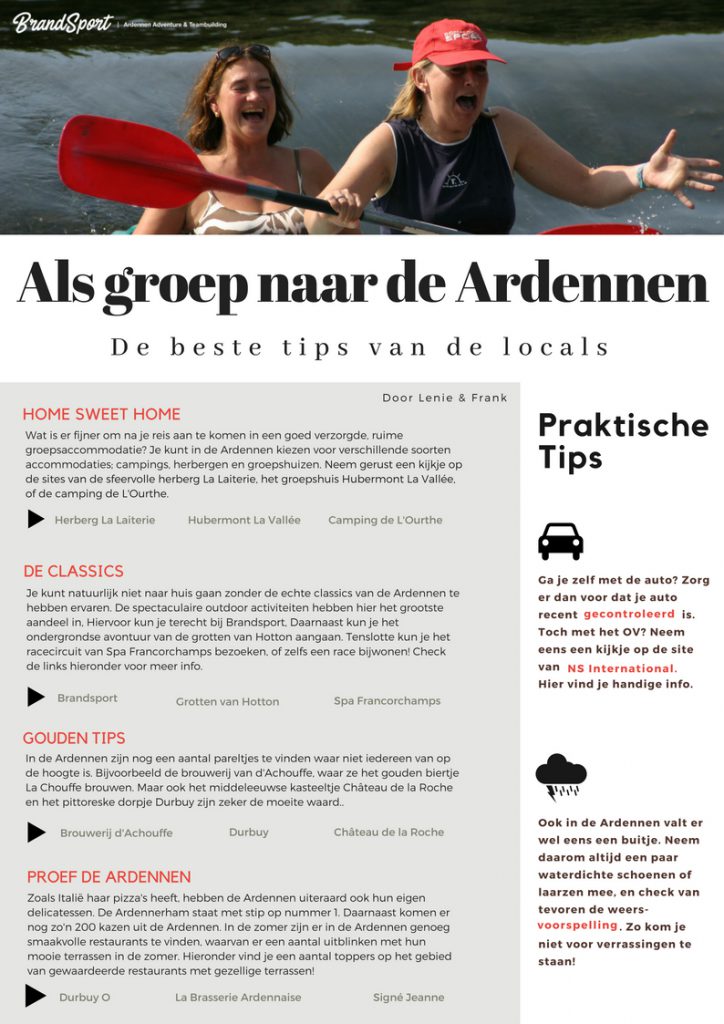 Helaas is een weekendje vaak verrassend snel voorbij. Daarom is het belangrijk om van tevoren goed te bedenken wat je wilt gaan doen, zodat iedereen het naar zijn zin heeft. Om je te helpen bij het ideale vrienden-/familieweekend, heeft Brandsport de belangrijkste tips verzameld voor wanneer je met een groep naar de Ardennen gaat.
