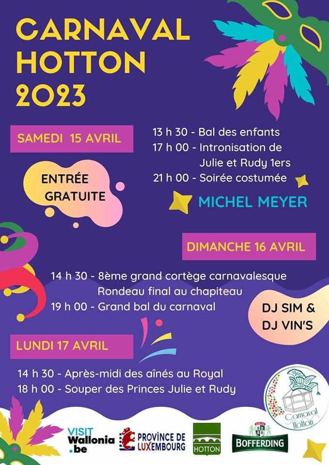 In Hotton is het carnaval van 15 tot en met 17 april. Carnaval is in Wallonië een groot feest zoals het op vele plaatsen is. Om het feestplezier wat te spreiden, viert niet elk dorp hetzelfde weekend Carnaval. In La Roche hebben we Carnaval in maart reeds gehad, we kunnen met z’n allen dus afzakken naar Hotton. Er zijn activiteiten voor jong en oud het hele weekend lang. Aarzel dus zeker niet om langs te gaan als je in de buurt bent!